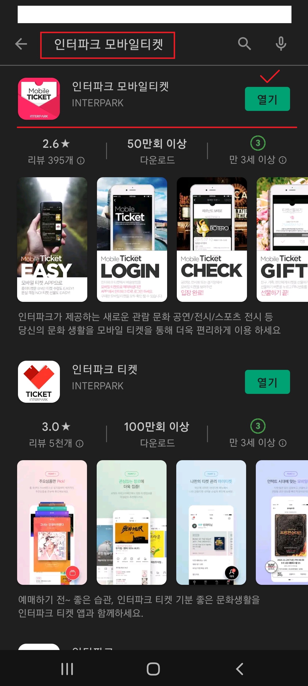 (2) 앱스토어 또는 플레이스토어에서 [인터파크 모바일 티켓]을 다운받습니다.