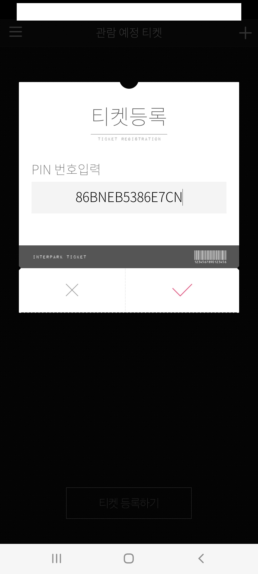(3) 'PIN번호 등록하기' 버튼을 누르면 바로 인터파크 모바일티켓 앱으로 이동하여 PIN번호가 자동으로 입력되며